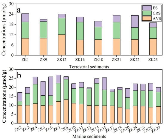Reductive inorganic sulphur species concentrations of sediments in the Dongzhai Harbour mangrove wetland. (a) distribution of concentrations of ES, CRS, and AS in terrestrial sediments. (b) distribution of con-centrations of ES, CRS, and AS in marine sediments.