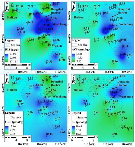 Spatial distributions of reductive inorganic sulphur species concentrations in sediments from the Dongzhai Harbour mangrove wetland. (a) Spatial distribution of reduced inorganic sulphur (RIS). (b) Spatial distribution of acid-volatile sulphur (AVS). (c) Spatial distribution of chromium-reducible sulphur (CRS). (d) Spatial distribution of elemental sulphur (ES).