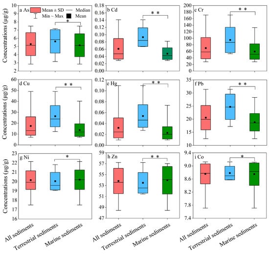 Heavy metal concentrations of sediments in the Dongzhai Harbour mangrove wetland. * and ** denote p value < 0.05 and 0.01, respectively. ((a) Distribution of chromium (Cr) concentrations. (b) Distribution of zinc (Zn) concentrations. (c) Distribution of lead (Pb) concentrations. (d) Distribution of nickel (Ni) concentrations. (e) Distribution of arsenic (As) concentrations. (f) Distribution of cadmium (Cd) concentrations. (g) Distribution of copper (Cu) concentrations. (h) Distribution of mercury (Hg) concentrations. (i) Distribution of cobalt (Co) concentrations).