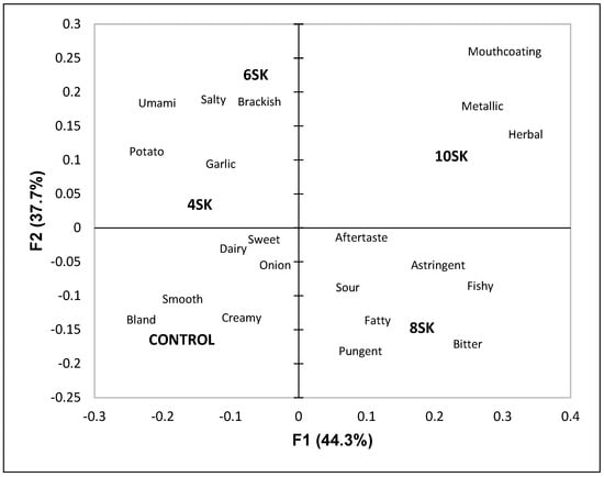 The 4SK and 6SK were grouped together and were associated with potato, garlic, umami, salty, and brackish properties. Umami and saltiness have been associated with seaweed in previous studies [46,47,48,49] and these results reinforce two different seaweed applications that researchers have investigated. Firstly, seaweed addition to food can increase saltiness perception and may be an approach for the food industry to formulate new low-salt food items [50]. Secondly, sugar kelp addition can increase the umami taste in foods [48,51], which may be able to help improve the sensory perception of salt-reduced foods [52]. At lower levels of sugar kelp addition, saltiness and umami were enhanced, before the participants associated the foods with off-flavours perceived in higher concentration samples (i.e., samples 8SK and 10SK). The control was also associated with a bland taste and once the sugar kelp was added, the soups were associated with umami, indicating again that sugar kelp may be able to enhance the flavour of food products (at low levels of addition). Brackishness was also associated with foods containing sugar kelp in the researchers’ previous study on couscous containing sugar kelp [15]. In the previous study, a brackish quality was a driver of disliking but that was not found in this study (Figure 2). The differences in results may be due to the different food items evaluated, as the previous study evaluated couscous while this study added seaweed to soup. Lastly, the control was associated with bland, smooth, creamy, onion, dairy, and sweet. These attributes have been found in previous studies investigating potato-based soups [53,54,55,56,57].