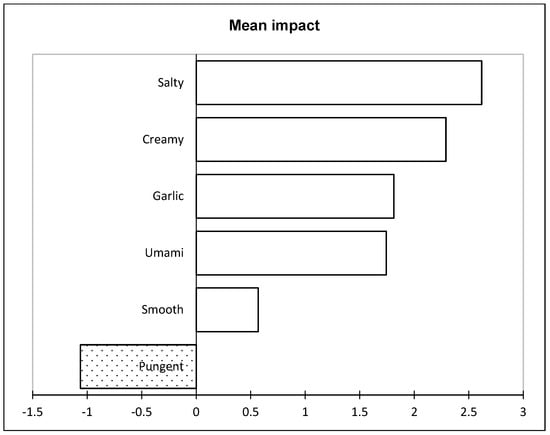 Figure 2 outlines the results of the penalty lift analysis based on the CATA question and the overall liking scores. Salty, creamy, garlic, umami, and smooth properties increased the participants’ overall liking. Pungency negatively impacted the participants’ liking scores.