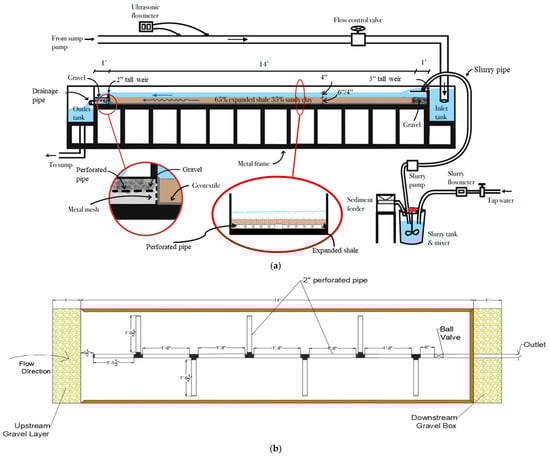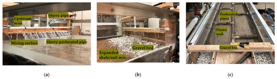 The experiments used two underground sumps to maintain a continuous water supply, controlled by a valve installed on the inlet pipe. The discharge was measured using an ultrasonic flowmeter, with measurements cross-checked using volumetric methods. A 3-inch (7.5 cm) high rectangular weir installed at the flume entrance ensured uniform flow distribution across the flume. A wooden plank placed downstream of the weir facilitated the mixing of the sediment slurry with the inflow, which was introduced via a perforated pipe (Figure 2a). A layer of gravel at the flume’s entrance was used to mitigate scouring (Figure 2b). An underdrain system featuring 2-inch (5 cm) perforated pipes wrapped in geotextile was installed and controlled by a ball valve (Figure 2c). A rectangular gravel-filled box with a 6-inch (15 cm) opening allowed for water flow, incorporating mesh and geotextile to retain soil. A perforated pipe within the box directed infiltrated water to the outlet tank. To regulate water depth over the soil media, a check dam was installed downstream of the flume, with a weir for overflow, ensuring a minimum water depth of 4 inches (10 cm) over the soil media (Figure 1).