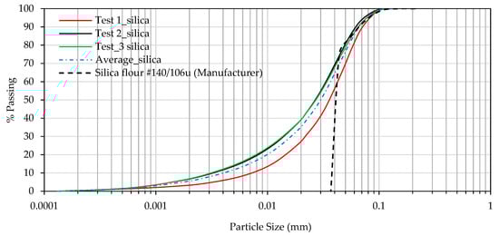 Silica flour was used for the slurry, and its size gradation was verified through three tests using an SALD-7101 nanoparticle size analyzer. The manufacturer’s gradations matched our lab data for particles up to 0.037 mm in size but did not provide data for smaller particles (Figure 3). Therefore, the lab data were used in the study. The selection of silica flour complied with the sediment particle size distribution requirements outlined by the New Jersey Department of Environmental Protection (NJDEP) [41]. All sediment classes met or exceeded the minimum passing criteria, confirming the suitability of the silica flour to replicate suspended sediment loads typical of urban stormwater. Additionally, geotextile with a #80 size rating (0.18 mm opening) was used in conjunction with the engineered mix of expanded shale, which was more than 90% finer than 0.18 mm. The silica flour had a maximum particle size of 0.13 mm, ensuring that the geotextile would not trap sediment particles and prevent clogging over time.