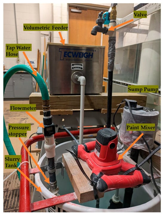 Silica flour and tap water were mixed in a tank equipped with a mixer to maintain a uniform suspension, while a float valve regulated the water level in the tank. A flowmeter monitored water discharge into the mixing tank, while a volumetric sediment feeder controlled the injection of silica flour. A sump pump ensured consistent slurry flow into the flume, with a valve installed for sample collection to verify sediment concentration (Figure 4). This setup provided a precise and constant rate of slurry entering the flume.