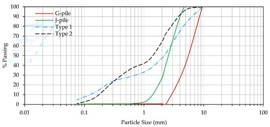 Sieve analysis tests were conducted for both types of expanded shale, as well as for the soil media prepared using these two types. All tests followed the ASTM-D6913 standard [42]. Figure 5 presents the gradation curves obtained for coarse (G-pile) and fine (J-pile) expanded shale, along with the Type-1 and Type-2 mixes.