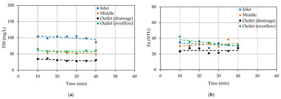 Equation (3) was also used to calculate the reduction in turbidity (Tu) by replacing TSS values with Tu measurement in this equation.