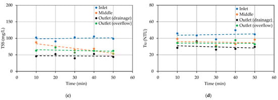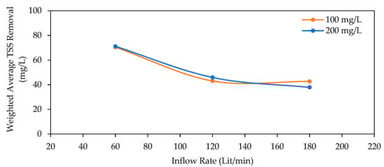 Results from experiments with varying inflow rates and influent sediment concentrations confirmed that the overall efficiency of the swale, driven by infiltration, filtration, and sedimentation processes, was higher under low-inflow conditions. The TSS removal efficiency remained consistent despite increases in incoming sediment load. However, it was observed that TSS removal efficiency decreased as the inflow rate increased, as shown in Figure 7.