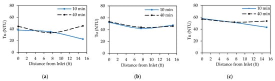 Observations presented in Figure 8 show a general decreasing trend in turbidity within the first half of the channel’s length for all three inflows (60, 120, and 180 Lit/min). However, results for the second half of the channel were inconclusive. Turbidity decreased during the first 10 min of the experiments but increased again by the end of the experiments at t = 40 min.