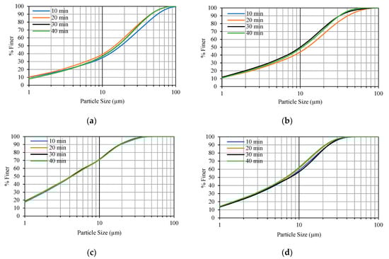 This study analyzed changes in suspended sediment gradation over time at all sampling locations within the flume. Samples were collected at 10, 20, 30, and 40 min from the start of each experiment at the inlet, middle section, overflow, and underflow. The gradation curves for experiments conducted with Type 2 soil media (with underdrain), an inflow rate of 180 Lit/min, and an influent suspended sediment concentration of 100 mg/L are shown in Figure 9. These figures illustrate samples from the flume’s inlet, middle section, underflow, and overflow. The results show that the sediment injected into the flume had a small variation in size, and except for minor changes in the gradation of suspended sediment from the middle section, all sediment gradation curves at other sampling locations remained similar throughout the experiments. This consistency suggests that both flow and sediment regimes were in equilibrium, and the soil media did not become clogged during the experiments. If swale performance had degraded, sediment gradation would have shifted over time. However, the results in Figure 9 indicate that sediment became finer along the length of the flume. The suspended sediment at the inlet had about 10% of particles smaller than 1 micron, increasing to ~13% in the middle section and ~20% in the underflow. Sediments in the overflow were slightly coarser than those in the middle section. This phenomenon is explored further in the following section.
