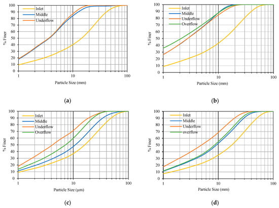 Figure 10 presents the gradation curves from experiments with inflow rates of 60 and 180 L/min, along with two different influent concentrations, i.e., 100 and 200 mg/L. As depicted, the sediment composition changes along the channel varied considerably between the two inflow conditions (Figure 10a vs. Figure 10c and Figure 10b vs. Figure 10d).