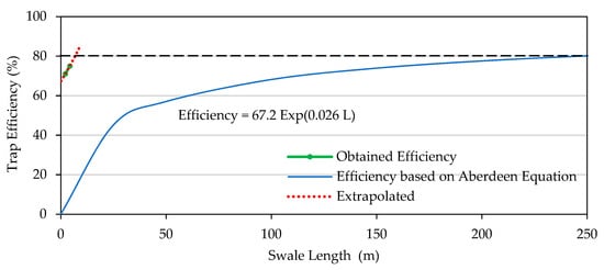 Lastly, the theoretical required length of the flume to achieve 80% suspended sediment removal, solely through particle settling, was determined using the Aberdeen equation. The trapping efficiency was calculated for various hypothetical flume lengths and compared as per the Aberdeen equation (Equation (4)).