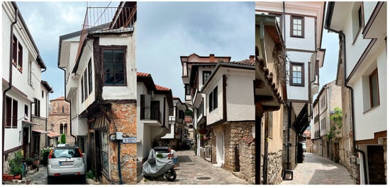 The town of Ohrid features well-preserved late Ottoman residential architecture, that has shaped its historical street pattern, alongside medieval churches, and numerous archaeological remains. Among Ohrid’s historical landmarks are ancient Slavic monasteries [38], and various archaeological sites, creating a unique blend of cultural influences that dominantly shape the urban landscape of Ohrid. The built environment and architectural creativity noticeable in the Ohrid resulted from the people’s struggle to stay within the city walls during the Ottoman times, creating a dense yet consistent urban surrounding [39].