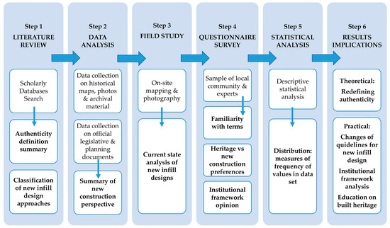 Step 6 presents the research implications through qualitative analysis and synthesis. These implications are discussed as theoretical and practical contributions (see Figure 2). Theoretical implications focus on redefining the concept of authenticity in heritage protection issues. Practical implications could indicate the potential need for changing guidelines for new construction, the importance of enhancing the understanding of heritage protection through educational programs, and the necessity of reconfiguring the institutional framework and the roles of stakeholders in decision-making processes.