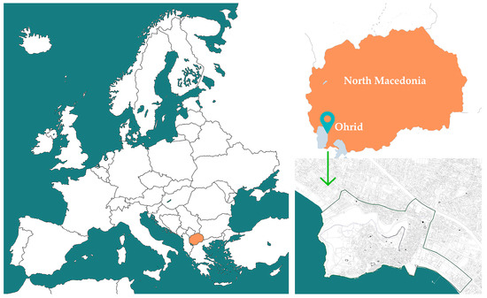 Ohrid is located in the Balkan region of southeastern Europe, within the present-day Republic of North Macedonia (Figure 3). As it is situated on the shores of the Ohrid lake, Ohrid has a rich tradition of human settlement, resulting in its multi-layered historical legacy. Its urban morphology was constantly evolving alongside Europe’s political history. The power struggles of the Roman and Byzantine empires, the spread of Christianity, Slavic migration in the Balkan peninsula, and centuries of Ottoman domination have shaped the urban physiognomy of Ohrid.