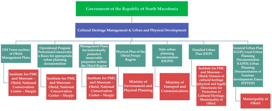 The UNESCO WHL has a significant influence on development and redevelopment matters. The real influence of the WHL is its protection of cultural heritage from uncontrolled urban modernization, and its offering of potential tools for improving that protection [5]. The management of urbanization in the Ohrid region relies on a combination of international oversight and domestic legal frameworks. The Management Plan for the Natural and Cultural Heritage of the Ohrid region, drafted in 2019, is the primary instrument for managing urbanization in the Ohrid region [51]. The plan was theoretically developed in line with good European and global practices, but its implementation remains highly questionable. While UNESCO and ICOMOS play a significant role in monitoring and providing recommendations, the effectiveness of heritage conservation depends largely on national and local legislation [52]. Various levels of decision-making were introduced, which prolonged the process of obtaining construction permits, without improving the quality of the built environment. The National Conservation Center in Skopje and the Institute for PMC and the National Museum in Ohrid are responsible for undertaking each protection and conservation measure associated with world heritage according to their respective competencies, in line with national laws and UNESCO recommendations. Several other institutions and governmental bodies are also drafting relevant plans and strategies. Figure 4 provides an overview of relevant plans, strategies, and responsible institutions for the Ohrid region.