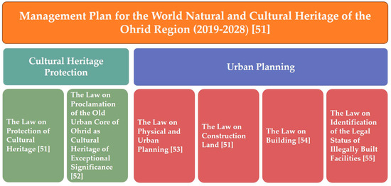 - The Law on Proclamation of the Old Urban Core of Ohrid as Cultural Heritage of Exceptional Significance (“Official Gazette of the Republic of Macedonia” No. 47/11 and 154/15). Available online: https://www.moepp.gov.mk/wp-content/uploads/2014/12/Management-Plan-Ohridski-Region_ENG.pdf (accessed on 3 October 2024).