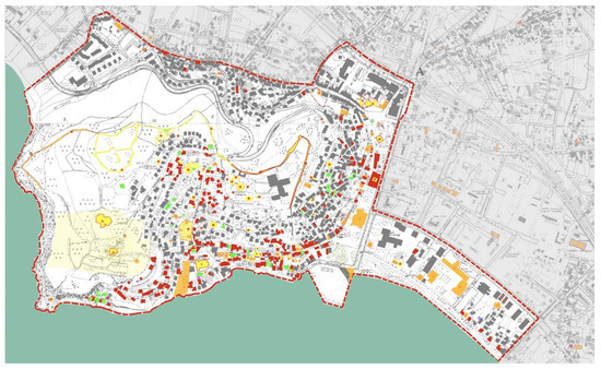 The map of the old town of Ohrid with monuments of culture and buildings with historical values (yellow and orange), buildings with ambient values (red), buildings that have lost their monumental status (green), new buildings with recognized architectural values (grey), and unclassified buildings (white).