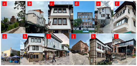Field study in June 2024—examples of different building styles in the old town of Ohrid. (a) medieval Orthodox building; (b) newly constructed building referencing neo-classical style; (c) building from the Ottoman period; (d) building from early interwar modernist period; (e) newly constructed building that adapts traditional architectural elements; (f) newly constructed building that emphasizes certain original and newly designed elements to create a more equal relationship between them and traditional architecture; (g) building from the post-war modernist period; (h) newly constructed building that replicates traditional architectural elements; (i) newly constructed building that references traditional architectural elements in an abstract way; (j) interwar Yugoslav building built in neo-classical style; (k) newly constructed building that references traditional architectural elements; (l) newly constructed contemporary building with a strong contrast to traditional architectural elements.