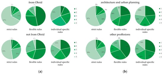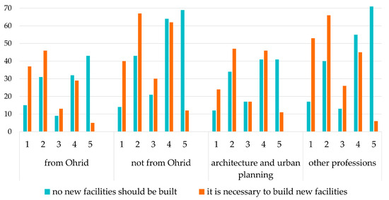 Figure 10 illustrates the distribution of answers related to new construction regarding living place and profession. Notable differences in attitudes towards the necessity for new construction are evident. A proportion of 28.5% of people from the local community “completely disagree” with that idea, while only 19% of non-locals share the same opinion. Professionals engaged in architecture and/or urban planning tend to have a more flexible understanding of new construction needs.