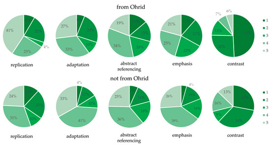 Figure 11 presents the distribution of answers related to new infill design approaches regarding living places. A proportion of 66% of people from Ohrid and 55% not from Ohrid prefer designs that fully imitate traditional architecture—the replication method (values 5 and 4 on the Likert scale). However, participants not living in Ohrid are more open to introducing new architectural elements in the infill designs. A proportion of 49% of respondents from Ohrid are totally against the contrast method (value 1), while only 6% support this idea (value 5).