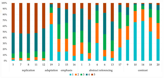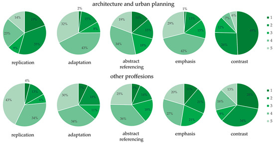 Examples 5, 7, 8, 11, and 12 completely imitate traditional architecture (replication method). Example 19 illustrates adaptation (there are no other examples from this approach in the subject area), and examples 2, 15, and 16 to the emphasis approach. The contemporary interpretation of traditional architecture (abstract referencing) is presented through examples 1, 3, 4, 6, 13, and 17, while examples 9, 10, 14, 18, and 20 exemplify the expression approach that does not acknowledge the characteristics of traditional architecture (contrast method). The questionnaire randomly ordered photos of newly designed buildings. Questions 8–10 utilized the Likert 5-degree scale (from “I completely disagree” to “I completely agree”).