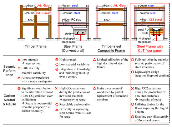 As summarized in the figure, modern timber structures, which have seen significant development in recent years, are often considered symbolic of the “carbon-neutral” era [2,3,4,19,20,21]. In Japan, the Act for Promotion of Use of Wood in Public Buildings was enacted in 2010 [22], introducing initiatives such as government subsidies to encourage the construction of wooden buildings. Nakano et al. calculated the GHG emissions of buildings using CLT (Cross-Laminated Timber) panels that meet Japan’s seismic standards, concluding that CLT is a promising building material capable of reducing environmental impact even in earthquake-prone regions [23]. However, in this disaster-prone country, uncertainties arising from variations in material quality cannot be overlooked, and the mechanical properties of connections remain less explored compared to steel structures. In particular, studies examining the ultimate failure state of timber buildings during major earthquakes remain insufficient. On the other hand, steel structures, known for their high strength and toughness, have continuously evolved over the past century in response to damage caused by major earthquakes in Japan. Their design and construction technologies have been refined to achieve a high level of seismic performance today. Although the production of new steel materials results in significant CO2 emissions, steel structures offer the advantage of being relatively easy to reuse. This is due to their high strength, which allows for large spans with minimal cross-sections, enabling flexibility in floor plans. Additionally, as prefabricated structures, they are easy to disassemble, making the efficient reuse of structural members highly feasible. A major challenge lies in the difficulty of dismantling concrete slabs and steel members that are integrally connected through studs. Steel–timber composite systems have been proposed as a means to reduce CO2 emissions in steel construction, such as by partially replacing steel members with timber [24]. However, the use of timber is limited, and challenges remain regarding the seismic reliability of connection methods between the different structural materials. In response, a “steel frame structure with CLT floor panels”, which retains the steel frame as the structural skeleton while using CLT floor panels as a substitute for RC slabs, could be one of the most promising solutions. While floor materials require the largest volume of material, they are not primary seismic structural elements. This makes it possible to extensively use timber without relying on its variable properties for seismic safety. Reference [25] reports that replacing reinforced-concrete floors in steel structures with CLT can achieve up to a 20% reduction in global warming potential (GWP) compared to steel–concrete floors, even when designed to meet 1 h and 2 h fire resistance ratings. Furthermore, if the connection between the CLT floor panels and H-shaped steel beams is designed as a detachable joint, construction efficiency can be improved compared to RC slabs. At the same time, the complete reuse of all major structural components becomes feasible.