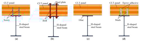 Examples for connection details between H-shaped steel beams and CLT floor panels. (a) Connected by screws, (b) connected by bolts, (c) connected by glue, (d) connected by studs and filled epoxy.