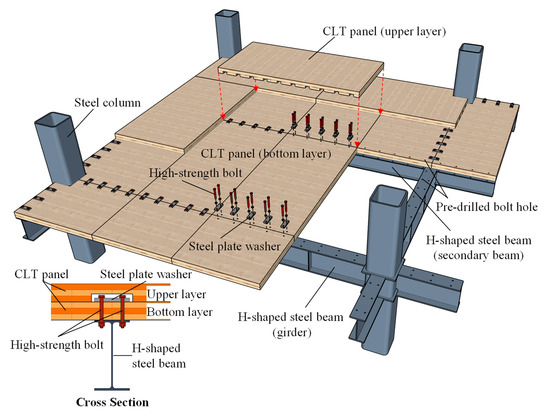 Scheme outline of CLT floor panel and H-shaped composite beam connected with high-strength bolts.