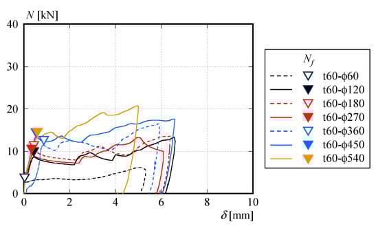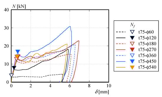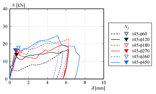 Figure 5, Figure 6 and Figure 7 show the results of two-surface shear tests for CLT panel thicknesses of tclt = 45, 60 mm, and 75 mm. The vertical axis represents the applied shear force N, while the horizontal axis represents the displacement δ measured by the Amsler testing machine. From the figure, the displacement increases linearly at low shear forces. However, upon reaching a certain load, the shear force momentarily decreases slightly, followed by a region of increasing displacement. The point at which the shear force reaches its maximum within the range of linear increase and prior to the slight drop is defined as the point where static friction force Nf is achieved, indicated by inverted triangles in the figure.