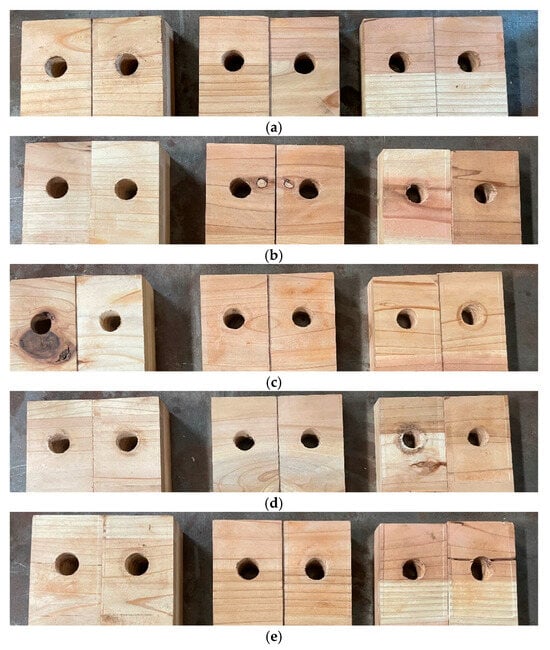 Condition of CLT pairs after two-surface friction test: left: tclt = 75 mm; center: tclt = 60 mm; right: tclt = 45 mm. (a) ϕ = 120°, (b) ϕ = 180°, (c) ϕ = 270°, (d) ϕ = 360°, (e) ϕ = 450°.