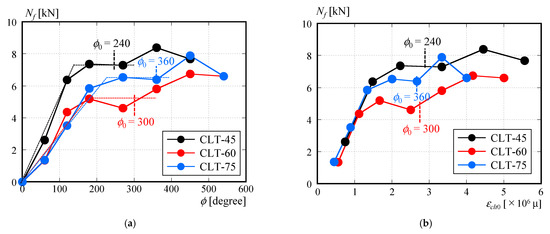 Figure 9a summarizes the relationship between the static friction force Nf between the CLT and steel plate and the nut tightening angle ϕ, as obtained from Figure 5, Figure 6 and Figure 7. The static friction force Nf was calculated as half of the shear force at the points indicated by inverted triangles in the figures. From Figure 9, for all CLT thicknesses, the static friction force Nf increases linearly at tightening angles ϕ = 60° and 120°, but tends to remain constant at ϕ ≥ 180°. In Figure 8, tightening marks on the CLT from the steel plate washer are observed starting at ϕ = 180°, indicating that the CLT likely experienced bearing yield. To generalize the relationship between the thickness of the CLT panels and the bolt rotation angle, Figure 9b illustrates the relationship between the static friction force Nf and the equivalent compressive strain of the CLT εclt, plotted on the horizontal axis. The compressive strain of the CLT εclt was calculated by determining the tightening displacement from the bolt rotation angle ϕ, based on the thread pitch of 2 mm for the M16 bolt, assuming that all compressive deformation occurs within the CLT. From Figure 9b, it can be observed that the initial stiffness is consistent across all CLT panel thicknesses, indicating that the axial deformation caused by bolt tightening occurs almost entirely within the CLT. In this study, the optimal bolt rotation angle ϕ0 for tightening the CLT floor panels in the four-point loading test described in Section 3 was determined by referring to the standard practice of tightening high-strength bolts in steel-to-steel friction joints with a specified torque, followed by an additional 120° rotation. The dashed line in the figure represents the experimental results modeled using a bilinear approximation to determine the tightening angle at which bearing yield occurs. Here, the optimal rotation angle was set as the angle at which the CLT undergoes bearing yield, plus an additional 120°. Accordingly, the bolt rotation angle ϕ0 was set to 240°, 300°, and 360° for CLT panel thicknesses of t = 45, 60, and 75 mm, respectively.