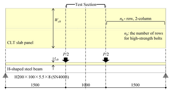 In the four-point bending test, an H-shaped steel beam with dimensions H200 × 100 × 5.5 × 8 (SN400B [47]) was used. This selection was based on reference [48], which evaluated the lateral buckling strength of H-shaped steel beams with folded plates. Similarly, reference [49] utilized a beam of the same size, HN200 × 100 × 5.5 × 8, to conduct a four-point bending test on a steel–timber composite beam. Figure 10 illustrates the variables to be determined for conducting a four-point bending test. In reference [38], a four-point bending test was performed on a specimen consisting of a CLT floor panel with a thickness of 80 mm and a width of 250 mm, fixed to an H200 × 100 × 5.5 × 8 steel beam. Likewise, reference [40] conducted a four-point bending test on a specimen with a CLT floor panel 90 mm thick and 500 mm wide, fixed to an H350 × 175 × 7 × 11 steel beam. However, these references and other related research [27,29,31,33,38] do not provide sufficient information on how the thickness and width of the CLT panels were determined. Therefore, in this study, the dimensions (tclt, Wclt) of the CLT panels for the test specimens were determined by referencing actual cross-sections of steel-framed rigid structures, as described below.