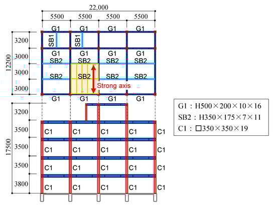The thickness of the CLT floor panel corresponding to a reduced-scale H-beam (H200 × 100 × 5.5 × 8) was selected so that the flexural stiffness and flexural strength ratios of the composite beam would approximately match those in a full-scale model building. Figure 11 shows the structural diagram of a building model described in the textbook on the design of steel structures provided by the Japan Society of Steel Construction [49]. The structure represents a four-story moment-resisting frame designed for office use. The office space consists of girders with a 9 m span and secondary beams placed at 3 m intervals. In the original example building, a 120 mm-thick reinforced-concrete slab with a deck plate was used. Here, it is assumed that CLT floor panels are applied to this building. Figure 11 indicates the strong-axis direction of the CLT panels. According to the Design Guidebook of CLT Buildings [50], the required thickness of the structural floor to meet the deflection limit is about 150 mm for a span of approximately 3 m. A project commissioned by the Japan Forestry Agency, which examined the use of CLT for flooring in steel-structured office buildings [51], found that while the adoption of CLT can reduce the weight of the structural slab itself, the need for fireproof coating limits the weight reduction to approximately 20% compared to conventional reinforced-concrete slabs with deck plates. Therefore, adopting CLT floor panels is not expected to fundamentally alter the structural design of the building. Accordingly, the building model shown in Figure 11 will be used as is.