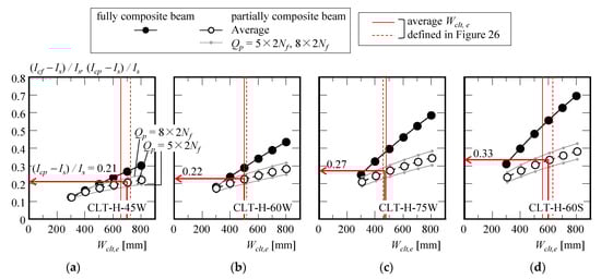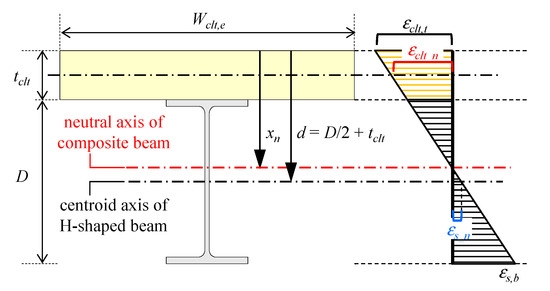 Next, the stiffness of the composite beam Icf of a CLT floor panel–H-shaped composite beam is calculated by Equations (3)–(8) based on the Bernoulli–Navier assumption, as illustrated in Figure 12. Icf, calculated using Equation (3) represents the flexural stiffness of the fully composite beam. In the equation, Is, As, D and Es represent the second moment of area, cross-sectional area, depth of the steel beam and Young’s modulus of steel, respectively. Iclt, tclt and Eclt represent the second moment of area, thickness of the CLT slab and Young’s modulus of the CLT panel. The term xn denotes the neutral axis of the composite beam, as illustrated in Figure 12. In Equations (6) and (7), εclt,t represents the strain at the top surface of the slab, while εs_n and εclt_n denote the axial strains occurring in the steel beam and the CLT slab, respectively.