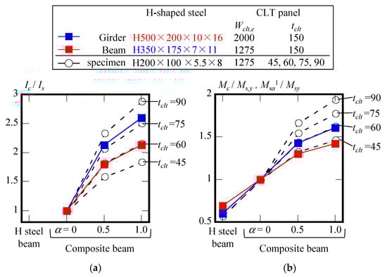 Figure 13 shows the ratio of the composite flexural stiffness and flexural yielding strength to those of the steel beam, with α as the variable, when the CLT floor panel is oriented in the weak-axis direction. The figure illustrates the ratio of the flexural yielding strength of the composite beam to the flexural yielding strength of the steel beam alone, assuming lateral–torsional buckling is fully restrained, as expressed in Equation (14). Here, σσs,y represents the yield stress of the steel beam. The effective floor width Wclt,e of the reduced-scale H-section steel beam with CLT floor panels (specimen) were assumed to be equivalent to those of a secondary beam, with an effective floor width of 1275 mm, corresponding to an H350 × 175 × 7 × 11. The Young’s modulus of the steel is Es = 205,000 N/mm2, and for the weak-axis direction of the CLT floor panel, a value of Eclt = 5000 N/mm2 was adopted based on reference [40], which used CLT composed of three layers of cedar, the same as the test specimens. From the figure, the flexural stiffness and flexural yielding strength of the composite beam for the assumed secondary beam H350 × 175 × 7 × 11 correspond to those of the scaled test specimen H200 × 100 × 5.5 × 8 when it is equipped with a CLT floor panel of approximately tclt = 45 to 60 mm. Therefore, in the test specimens used for the four-point bending tests described in Section 3.2, tclt = 60 mm was set as the standard, with tclt = 45 mm and tclt = 75 mm also considered.