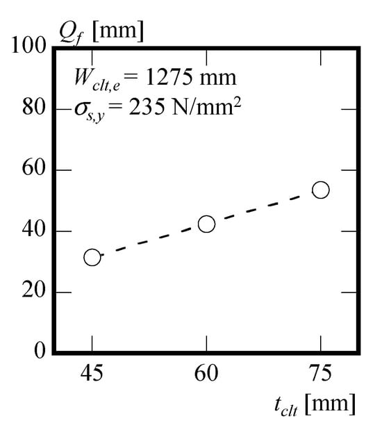 The shear force Qf acting on the interface between the upper flange of the steel beam and the CLT floor panel is calculated by Equations (15) and (16) when the bottom edge of the steel beam reaches its yield stress σs,y. Figure 14 illustrates Qf for a composite beam consisting of a steel beam (H200 × 100 × 5.5 × 8) and CLT floor panels with thicknesses of 45 mm, 60 mm, and 75 mm. The design yield strength of SN400 steel is 235 N/mm2 [57]. From Section 2, since the static friction force per high-strength bolt Nf was approximately 5 kN, it is determined that having nb = 3 rows at least for tclt = 45 mm, having nb = 4 or more rows for tclt = 60 mm and having nb = 6 rows for tclt = 75 mm would enable the achievement of a fully composite beam up to the point where the steel reaches its yield strength.