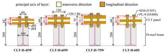 Table 3 shows the parameters of the test specimens for the four-point bending test. The thickness of the CLT floor panel tclt and the axial direction of the CLT were set as variables. One specimen consisted only of an H-shaped steel beam, while the other four were composite beams with CLT floor panels. The tightening force of the high-strength bolts was controlled by the bolt rotation angle, as shown in Table 3, based on the results from Section 2. Figure 15 illustrates the connection details between CLT floor panels and H-shaped steel beam. The section of the H-shaped steel beam was H200 × 100 × 5.5 × 8 (SN400B [46]). The CLT floor panels used were S60-3-3 (M60B), which had the same specifications and were manufactured simultaneously with the specimens used in the two-surface shear test described in Section 2.