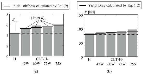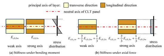 Table 4 and Table 5 summarize material properties of an H-shaped beam, which were obtained from tensile coupon tests, and CLT floor panel, which were obtained from a three-point bending test of CLT floor panels. The Young’s modulus Eclt,c related to the compressive stiffness of the CLT floor panel, shown in Table 5, was estimated from the Young’s modulus Eclt,b related to the flexural stiffness, obtained through the three-point bending test, following the procedure outlined in Figure 16.