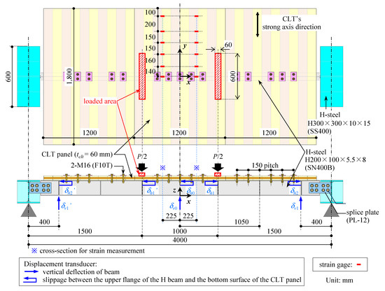 Figure 17 shows the test specimen and a schematic diagram of loading conditions for the four-point bending test. The beam span is 4000 mm, and the two-point loads are applied at a distance of 1000 mm apart. Both ends of the beam are connected to perpendicular end members (H300 × 300 × 10 × 15), assumed to represent girders, using M20 high-strength bolts [46] through splice plates. Stiffeners were installed at several locations on the H-shaped steel beam, including directly beneath the loading points, to prevent local deformation during the loading tests. Since the test specimen beam assumes a secondary beam, the CLT floor panels were arranged perpendicular to the H-shaped steel beam, as illustrated in Figure 11. The CLT floor panels measure 1200 mm × 1800 mm. Two high-strength bolts (M16, F10T) per cross-section were arranged with a 150 mm pitch, avoiding stiffeners and loading areas. The reason for adopting a 150 mm pitch is that the relationship between bolt tightening force and static friction force at the interface has not yet been examined for closely spaced bolts. Therefore, even when the CLT floor panel had a thickness of 75 mm, the pitch was chosen to avoid overlap in the influence range of the tightening force of adjacent bolts. Consequently, two high-strength bolts per cross-section were arranged in seven rows on each side symmetrically. Here, the upper surface of the upper flange of the H-shaped steel beam and the steel washer, which form the friction interface with the CLT floor panel, were all pre-rusted before connecting the CLT floor panel.