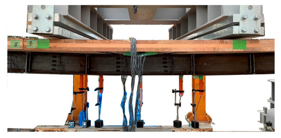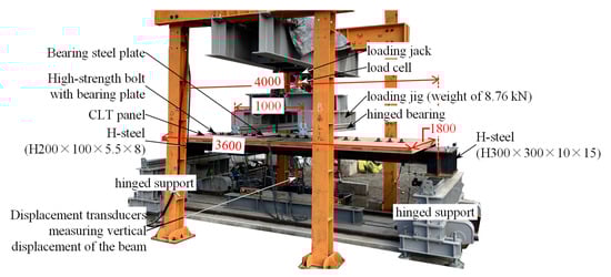 Figure 18 provides an overall view of the loading device. The end members at both ends are placed on hinged supports, and the load is applied using a jack at the center. The concentrated load from the jack is distributed into two points (spaced 1000 mm apart) through a loading jig and applied to the test specimen via hinge mechanisms. The loading jig is independent of the loading device (weighing 8.76 kN); it was first carefully placed using a chain block before starting the loading process. A 60 mm × 600 mm bearing steel plate was placed on the CLT floor panel directly beneath the hinge points to avoid local bearing failure. The loading area is indicated in red diagonal lines in Figure 17. In reference [54], which evaluates the effective floor width of CLT floor panels in composite beams of CLT floor panels and timber beams, a three-point bending test was conducted with a 2000 mm wide CLT floor panel subjected to a concentrated load at the center. While the loading width may affect the range of bending moments generated in the CLT floor panels, its impact on the composite action between the CLT floor panel and the H-shaped steel beam is considered minimal. The loading was applied in one direction, with the target termination deflection set at δ/L = 1/100 (δ = 40 mm) based on the span L. For the standalone H-steel beam specimen (Specimen H), the load had completely plateaued at δ = 40 mm, so loading was terminated at that point. However, for the CLT–H-steel composite beams, the load continued to increase gradually even at δ = 40 mm, so unloading was performed only after exceeding δ = 50 mm.