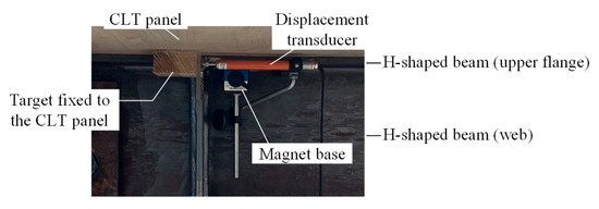 Measurement data were collected as follows: The load applied by the central jack was measured using a load cell. The vertical displacements of the beam, measured at the lower flange of the H-shaped steel beam, were recorded at three points with a displacement transducer fixed to the ground, as illustrated in Figure 17 and Figure 18. The relative displacements between the H-shaped steel beam and the CLT floor panel were measured at five points, as illustrated in Figure 17 using displacement transducers. As shown in Figure 19, a displacement transducer was fixed to a magnetic base attached to the upper flange of the H-shaped steel beam, targeting a wooden block fixed to the CLT.