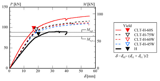 Figure 20 shows the relationship between the applied load P (as indicated in Figure 17) and the deflection at the center δ of the H-shaped steel beam for all test specimens. The right-side axis of the figure represents the acting bending moment M on the test section. Here, the central deflection δ is determined as the incremental value of δv0 measured at the center relative to the average of δv1 and δv1′, which were measured at both ends, as shown in Figure 17. The figure indicates P, corresponding to the yield moment Ms,y and the fully plastic moment Ms,p of the H-shaped steel beam under the assumption of no lateral–torsional buckling, using horizontal dashed and solid lines, respectively. In the figure, the inverted triangle indicates the point at which the strain value measured at the bottom flange of the H-shaped steel beam for each test specimen reached the yield strain. The yield strain was calculated by dividing the yield strength of the H-shaped steel σs,y by its Young’s modulus Es, both of which are given in Table 4. From Figure 20, it can be observed that fixing the CLT floor panels to the H-shaped steel beam using high-strength bolts improved both the initial stiffness and flexural yielding strength. The effect of CLT panel thickness (tclt = 45, 60, 75 mm) on the initial stiffness was not significant, with an approximate 20% increase compared to the test specimen consisting of only the H-shaped steel beam. On the other hand, changing the principal direction of the CLT panels from the weak axis to the strong axis resulted in an almost 40% increase in initial stiffness. Focusing on the yield points indicated by the inverted triangles for each test specimen, the flexural yielding strength exhibited a trend similar to that of the initial stiffness. Figure 21 shows the deflection shape of Specimen CLT-H-60S at δ = 40 mm.