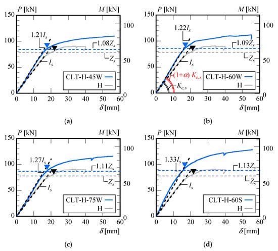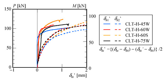 Figure 22 shows the progression of slippage between the CLT floor panel and the H-shaped steel beam with respect to the applied load P. As shown in Figure 17, displacement transducers were symmetrically arranged to measure the slippage. The horizontal axis values, δh1′ and δh2′, were calculated by averaging the measurements from transducers positioned equidistantly from the center and expressing them as increments from the central measurement. From the figure, δh2′, measured outside the bolt positions, exhibited slippage from the very beginning of loading. In contrast, δh1′ remained nearly zero under low loads. However, as the bottom flange of the H-shaped steel beam approached yielding, δh1′ also began to increase, showing a tendency for slippage displacement to progress at loads similar to those corresponding to yielding.