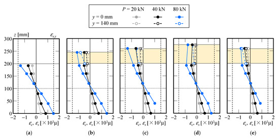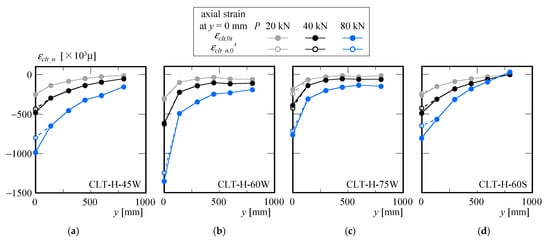 Strain distribution in the mid-span section. (a) H, (b) CLT-H-45W, (c) CLT-H-60W, (d) CLT-H-75W and (e) CLT-H-60S.