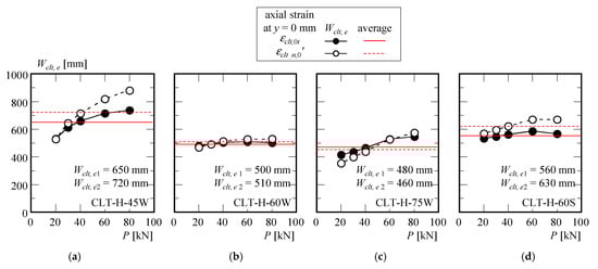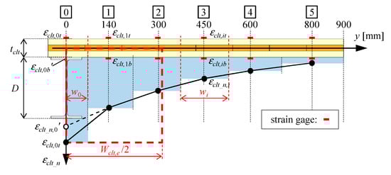 The effective width of the CLT floor panel in the composite beam consisting of the CLT floor panel and the H-shaped steel beam, joined by high-strength bolts, is estimated using the lateral distribution of strain values measured on the CLT floor panel, as shown in Figure 24. The y-axis in the figure is the axis in the CLT width direction, as defined in Figure 17. In the figure, the black plots represent the average strain measured on the upper and lower surfaces (εclt,it and εclt,ib), as expressed by Equation (17) where i denotes the location of a strain gauge, indicating the axial strain of the CLT floor panel εclt_n. At y = 0 mm (where the xyz-axis is defined in Figure 17), strain measurements were not conducted because the bottom surface of the CLT panel was joined to the upper flange of the H-shaped steel beam. In Figure 24, the black plots at y = 0 mm represent the strain measured on the upper surface of the CLT panel εclt,0t. The hollow plots represent the estimated axial strain εclt_n0′ using the difference between the upper and lower strains at y = 140 mm, calculated by Equations (18) and (19). The light blue shaded region in the figure will be explained later.