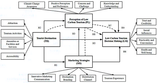 The hypotheses in this study are derived from extensive literature examining the relationships between tourist destination attributes, marketing strategies, perceptions of low-carbon tourism, and tourists’ decision-making processes. The formulation of these hypotheses is grounded in the Theory of Planned Behavior (TPB) and empirical studies related to sustainable tourism and environmental behavior. A total of eight hypotheses are proposed.