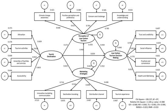 Low-carbon tourism decision-making (LM) serves as the key endogenous variable within the model. It is directly shaped by factors such as the choice of tourist destinations, perceptions of low-carbon tourism, and the influence of marketing strategies. This variable represents the model’s outcome, reflecting tourists’ decisions related to low-carbon tourism practices.