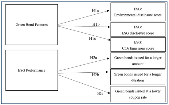 Similar to the above two associations, green-bond features are associated with our third dimension of ESG performance—CO2 emissions relative to sales. Typically, companies issuing green bonds with large amounts will exhibit emission profiles that are distinct from those of companies issuing smaller bonds because of variations in environmental management approaches. The first type of companies will have more structured emission control and disclosure practices due to the large scale of investment that is involved. Higher coupon rates in bond issuance indicate higher costs; this makes sustainability-focused investors monitor the environmental practices of the issuer very closely. This suggests possible associations between the cost of financing and emission management practices. Bonds with longer duration typically show emission profiles that evolve over extended periods, allowing the companies sufficient time to make improvements to their emission management systems. In this manner, companies issuing bonds with different combinations of features demonstrate distinct emission profiles, pointing to possible associations between green-bond features and emission control practices over time [86]. On the basis of the above, we offer the following hypothesis: