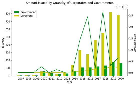 There have been significant transformations in the financial landscape worldwide, with sustainability emerging as a crucial factor in investment decisions. Most companies are increasingly incorporating environmental, social and governance (ESG) considerations into their corporate policies [1,2,3,4,5,6,7]. As part of this evolution, green bonds have emerged as financial instruments that function as a bridge between traditional investing and environmental sustainability objectives. Green bonds are investments that are targeted for environmentally beneficial projects, such as green buildings, resource conservation, renewable energy, and other initiatives [8,9,10,11,12,13]. Over the years, the green-bond market has evolved from a niche to a mainstream phenomenon. Notable instances of corporate green-bond issuance include Unilever’s $250 million green-bond issuance in March 2014 for reducing water usage and greenhouse gas emissions, and Apple’s $1 billion green-bond issuance in June 2017 for financing energy efficiency and renewable energy in its factories and supply chain facilities [11]. The present increasing surge in green bonds has been characterized as a green-bond boom by Morgan Stanley [11].