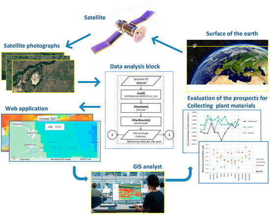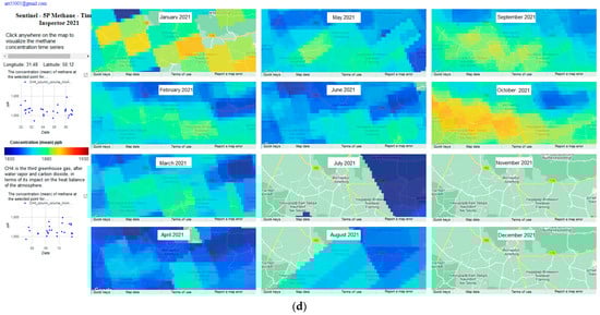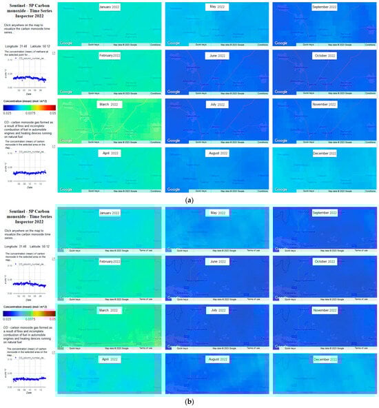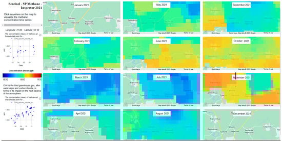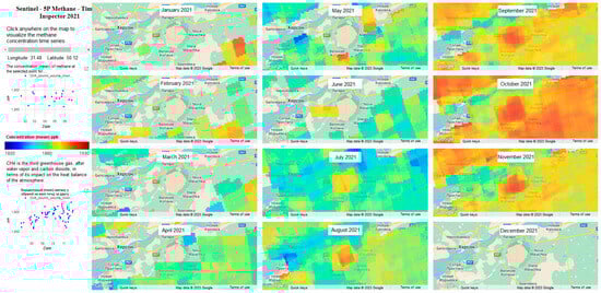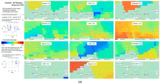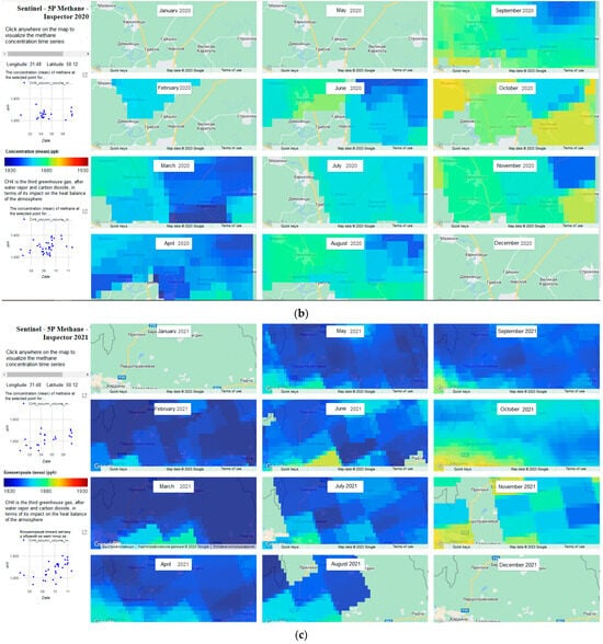 This research was conducted using the techniques developed by specialists from the National Center for Control and Testing of Space Facilities of Ukraine (https://spacecenter.gov.ua/, accessed on 25 February 2025). Monitoring of methane and CO concentrations was carried out based on satellite monitoring data, which is obtained as part of the first mission dedicated to air monitoring; Sentinel-5P under the European Union (EU) Earth observation program—Copernicus (https://www.copernicus.eu/en/about-copernicus, accessed on 25 February 2025). The software is described in a previous study by S.A. Shvorov et al. [23] on urbanized technologies. We used data from the period January 2020–June 2023. Since satellite monitoring requires appropriate weather conditions, the number of measurements per month varies throughout the year; this research used the arithmetic average data per month. Since the data resolution is several km2/pixel, positioning was carried out in the center of the study area. The repeatability of positioning in different years was monitored by fixing the coordinates of the points displayed in the web application (Figure 7).